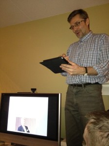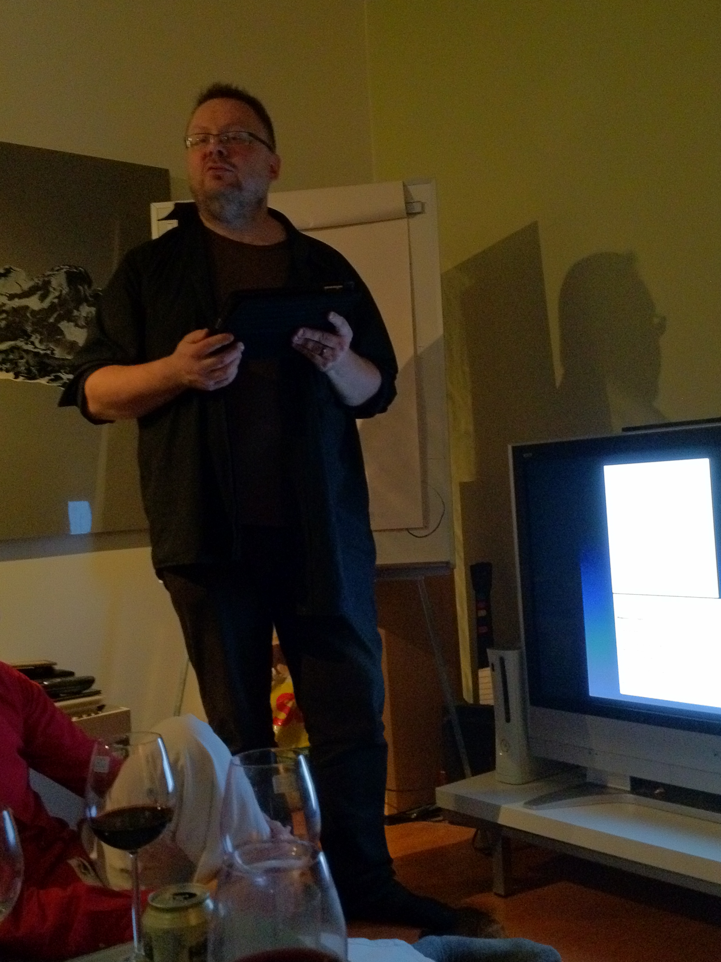 Illan päätteeksi oli oma esitykseni, joka oli sopiva ’closing statement’ koko illan annista. Linkki esitykseen löytyy tästä. Mistä siinä siis oli kysymys? Koko illan teemahan oli oppiminen, oppimisen ilo ja yhdessä oppiminen. Oma esitykseni kertoi siitä, miksi tieteilijöiden kokoontuminen jakamaan tietoa on hyödyllistä, tai miksi tiedon jakaminen ylipäänsä on tarpeellista. Tuon illan tapaisia tilaisuuksia tarvitaan, jotta mieli pysyy virkeänä ja sielu sekä ruumis ravittuna. Niin, ja teknologiaakin käytimme apuna: Apple TV, Mac Book, iPad, vanhat kunnon Nokian puhelin, sähkökitara ja fläppitaulu ja sosiaalisena mediana tuo oma Prezini.