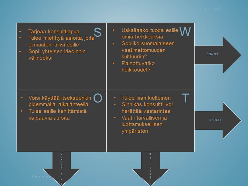 Teimme pienen kokeilun, jossa annoin pohjaksi työskentelyyn pienelle ryhmälle ICT-asiantuntijoita yllä olevan kuvauksen SWOT-analyysistä. Tämän jälkeen opastin työskentelemään työpareina, joissa toisen roolina oli olla konsulttina ja toisen konsultoitavana. Pyysin hyödyntämään yllä olevia apukysymyksiä. Viidentoista minuutin työskentelyn jälkeen edessä oli roolien vaihto. Työskentely tuotti hyviä analyysejä, jotka toivoakseni hyödyttivät myös tulevien tavoitteiden asettelua. Työskentelyn purkuvaiheessa pyysin konsulttia kertomaan konsultoitavan vahvuuksista ja mahdollisuuksista ja suosittelemaan mielestään sopivia kehitystavoitteita keskustelun perusteella. Sovelsimme SWOT-analyysiä myös yhteisen työskentelyn arviointiin. Tämä yhteenveto näkyy yllä olevassa nelikentässä.